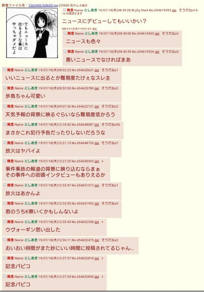 El día 19 de julio a las 8:40 am (hora Japonesa) un usuario del dicho foro mencionó que “debutaría en las noticias” hasta ahí podría ser solamente un post más, el asunto toma un color oscuro cuando a las 10:30 am ocurre el incendio. Otro post en la entrada a las 12:18 pm menciona la posible relación entre el post y el perpetrador del ataque.