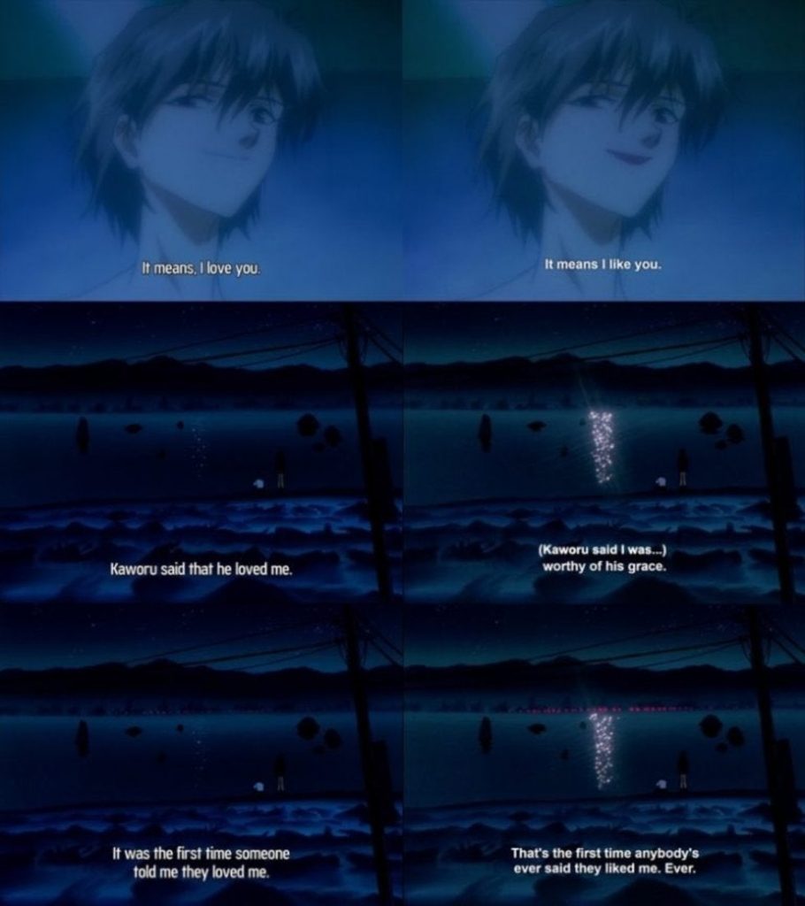 Es famoso y ultra conocido que en la escena Kaworu le dice a Shinji que lo ama y luego habla de la ternura que alberga el protagonista en su corazón. Sin embargo, los fans están criticando que la versión original no ha sido respetada….puesto que ahora Kaworu solo le dice a Shinji: “me caes bien”.