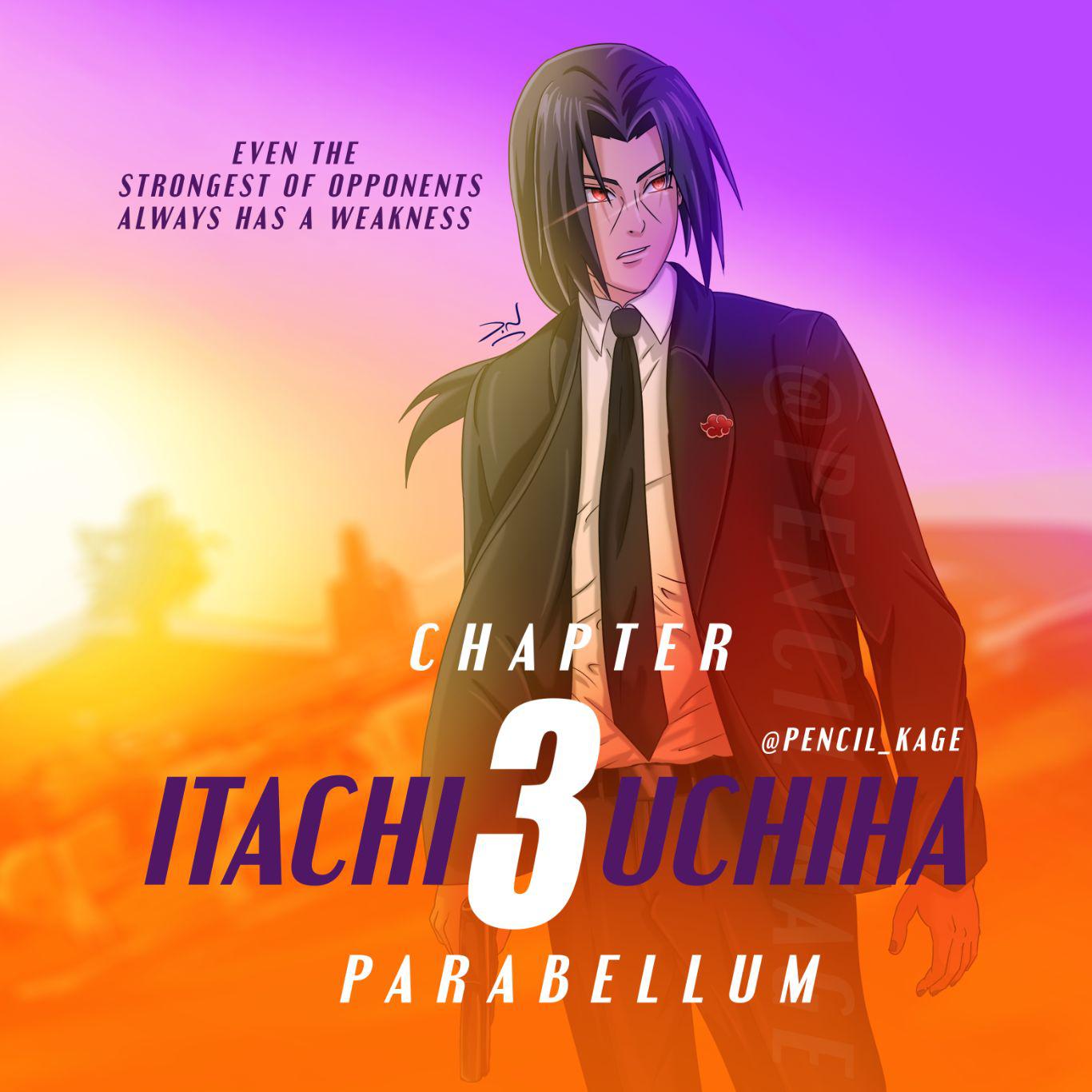 En el post que puedes encontrar al final de la noticia, puedes ver el hermoso dibujo que da vida al capítulo 3 de Itachi Uchiha: Parabellum, vestido con una chaqueta y un broche que representa el símbolo del clan Uchiha.
