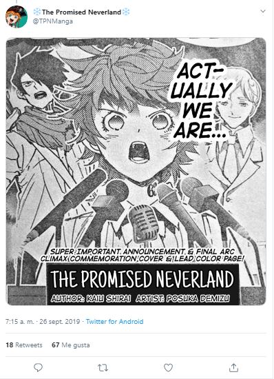 El manga de The Promised Neverland, autoría de Kaiu Shirai y Pozuka Demisu, tendrá un anuncio importante la semana que viene en las páginas de la Weekly Shounen Jump, pero al mismo tiempo se anticipó que la semana que viene esta obra entrará en el “C L I M A X” de su arco final.